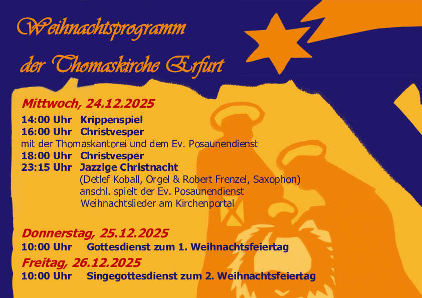 Mittwoch, 24. Dezember16:00Christvesper mit Chor und Ev. PosaunendienstThomaskirche