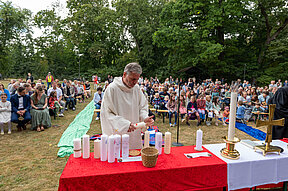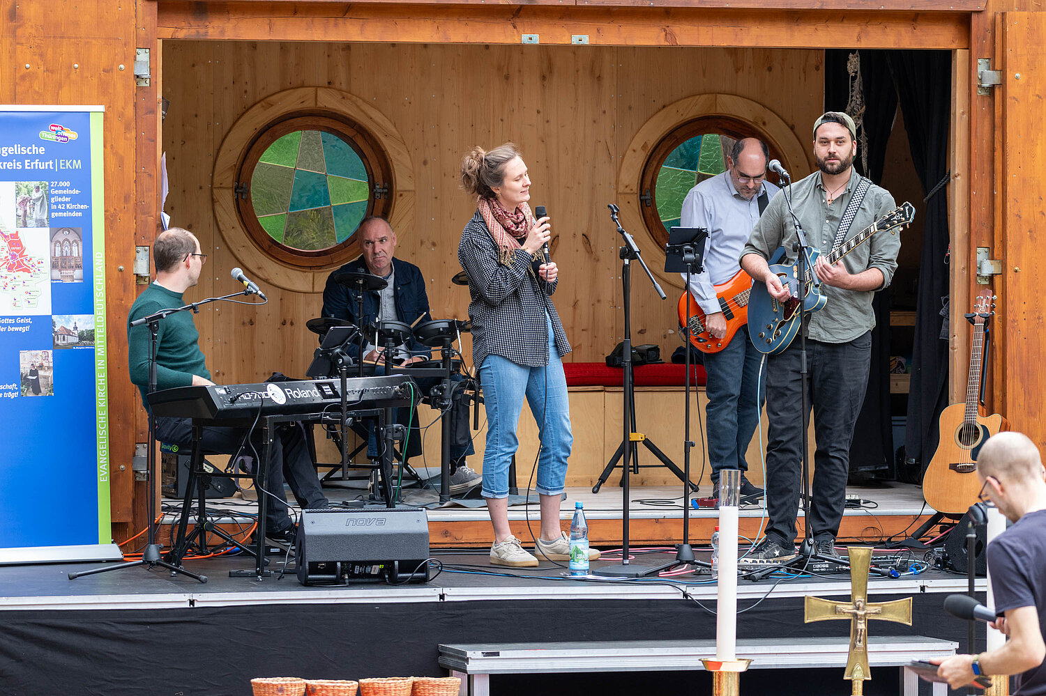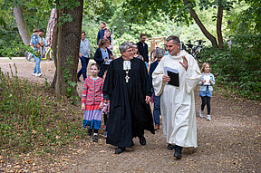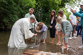 Die Predigt hielt Landesbischof Friedrich Kramer, der mit seinen Worten viele Herzen berührte. Für die 11 Täuflinge aus unserer Thomasgemeinde stieg Pfarrer Knoll gemeinsam mit den Täuflingen in die Gera, um sie im fließenden Wasser zu taufen.