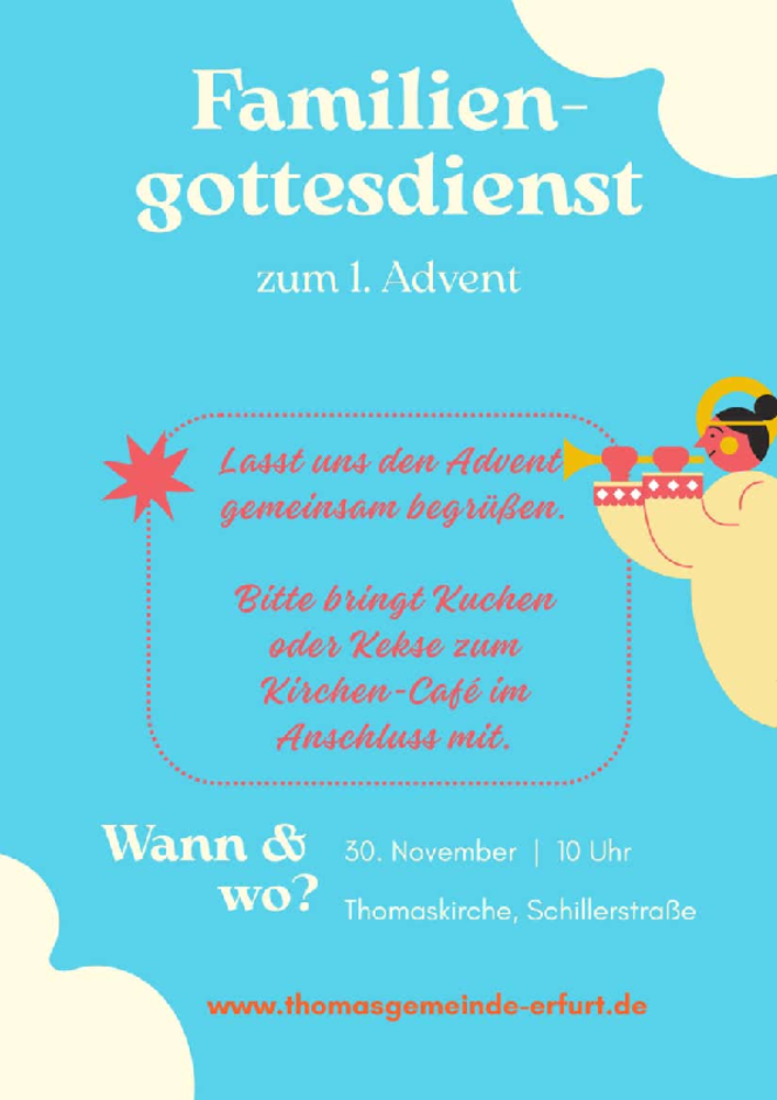 | Sonntag, 30. November | 10:00 | Familiengottesdienst zum 1. Advent, Verabschiedung und Einführung GKR, Kirchencafé | Thomaskirche |