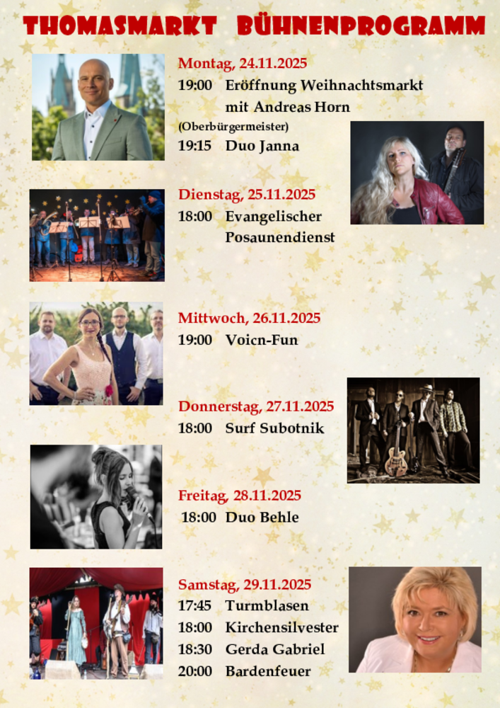| Samstag, 29. November | 17:45 | Turmblasen und Andacht zum Kirchensilvester | Thomasmarktbühne |